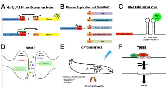 The study of RBP function within the nervous system requires a sophisticated toolkit that allows for precise spatio-temporal genetic manipulations, a vast array of tools for the visualization of neuronal morphology, as well as a variety of behavioral assays to probe neurological function. Drosophila offers an incredible toolkit for performing genetic manipulations within the nervous system and investigating their consequences on neuronal function and physiology. Below, we will highlight just a few of the basic tools, as well as some emerging technologies, that make Drosophila an outstanding model for neurogenetics.