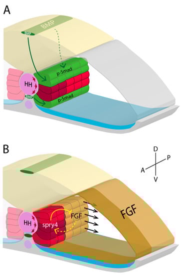 In addition to HH signalling, bone morphogenetic protein (BMP) signalling also has a role in specifying the adaxial compartment. The dorsal neural tube (roof plate) and hypochord embryonic structures are sources of the BMP ligand radar [,]. These structures are positioned dorsal and ventral of the notochord, respectively. Radar-mediated BMP signalling emanates from these structures to the closest, dorsal-most and ventral-most adaxial cells. Therefore, a dorsoventral signalling gradient of BMP signalling forms within the adaxial compartment, producing low levels of downstream BMP signalling factors (phosphorylated Smad proteins (p-Smad)) in the most midline-associated adaxial cells, and high p-Smad in other adaxial cells [,,] (Figure 1). Knockdown of radar function results in an attenuation of the BMP signalling gradient, and subsequently an increase in the number of MPs specified at the expense of SSFs [], showing BMP signalling (p-Smad) is repressive for MP specification. Maurya and colleagues (2011) identified that p-Smad accumulates within the nuclei of dorsal and ventral adaxial cells and directly represses HH-responsive Eng expression, showing BMP signalling can inhibit downstream HH signalling. Furthermore, such adaxial cells with low HH signalling and high BMP signalling have high levels of repressor forms of Gli, which potentiate the nuclear accumulation of p-Smads and subsequently represses MP fate. Interestingly, the physical structure of cells within the paraxial mesoderm can play a part in adaxial cell specification. The establishment of the BMP signalling gradient is modulated by the extracellular matrix (ECM). LamininC1, an ECM-deposited protein involved in basement membrane formation and cell-to-ECM attachment, helps shape the distribution of BMP signalling []. Mutant zebrafish lacking lamininC1 do not form MPs but are rescued by BMP knockdown. These data indicate LamininC1 reduces the dorsoventral progression of BMP through the ECM from the roof plate and hypochord, and thereby decrease or prevent BMP from reaching the MP precursor space [].
