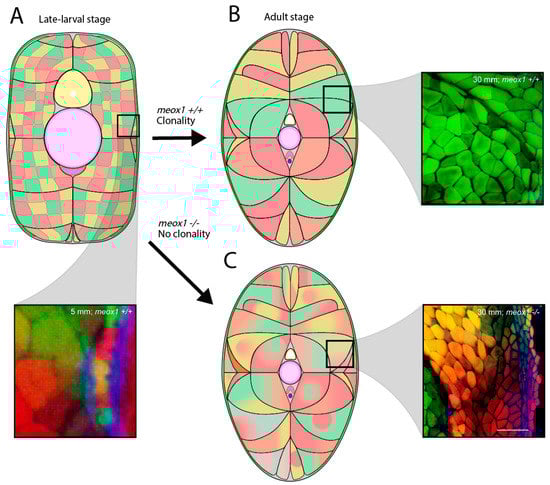 Schematic representing clonal dominance during the early stages of zebrafish secondary myogenesis, using the Musclebow system. (A) The late-larval stage myotome displays muscle fibres of different muscle stem cell origin, represented by different colours. Many muscle fibres are within a muscle bundle (black borders denote bundle boundary). (B) However, as growth progresses to adult stages, muscle fibres undergo clonal drift, where one muscle stem cell dominates growth within the muscle bundle. (C) Mutants for meox1 display defective ECL dynamics, and muscle fibres fail to drift towards clonality, represented by differing colours within one muscle bundle. Data images reprinted from Cell Stem Cell, 21, Nguyen, P.D. et al., Muscle Stem Cells Undergo Extensive Clonal Drift during Tissue Growth via Meox1-Mediated Induction of G2 Cell-Cycle Arrest, 107-119, 2017, with permission from Elsevier.