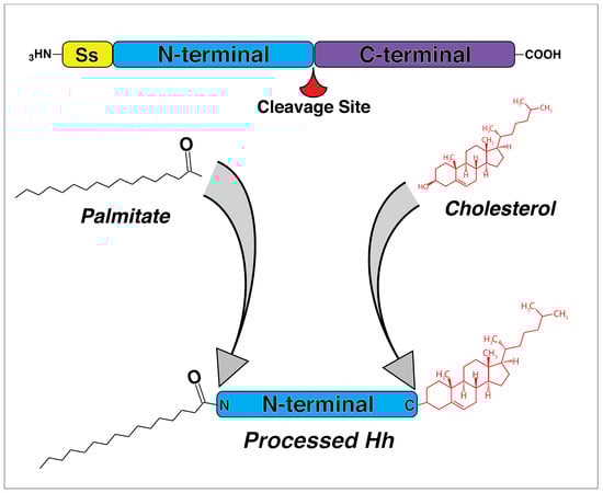 Biogenesis of processed Hedgehog (Hh) ligand. Hh ligand is produced as a large precursor protein that undergoes a series of post-translational modifications prior to secretion. The N-terminal signaling domain is first cleaved from the C-terminal processing domain. Subsequent to cleavage, the N-terminal has a palmitate added to its N terminus and cholesterol added to its C terminus, resulting in a biologically active, processed Hh ligand that may be transported out of the cell. Ss—Signal sequence. Adapted from reference [56].