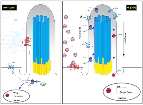 In the absence of Hh signal, Patched1 (Ptch1) inhibits the Hh pathway through the modulation of the Smoothened (Smo). Since Smo is inactivated, the Glioma-associated oncogene- Suppressor of Fused (Gli-Sufu) complex is retained in the cytosol, where it is exposed to phosphorylation by protein kinase A (PKA), thereby inhibiting signal transduction by Gli. When Hh signal is present (here represented by Shh), its binding to Ptch1 relives pathway inhibition, induces its translocation away from the cilium, allowing activated Smo and Gli-Sufu complex transport to the tip of the cilium, where Gli becomes dissociated from Sufu. Subsequent retrograde transport of Gli then brings it to the nucleus, where it regulates expression of target genes. Image adapted from Reference [76,77].