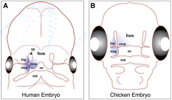 Fusion of the upper lip in human (A) and chicken (B) embryos reveals structural similarities. Across amniotes, the face is assembled from five main craniofacial prominences: the frontonasal mass (fnm), lateral nasal prominence (lnp), medial nasal prominence (mnp), maxillary prominences (mxp) and the mandibular prominences (md). The primary palate (upper lip/beak and nasal cavities/nasal pits [np]) forms from the fusion of the maxillary and lateral nasal prominences with the medial nasal prominence (highlighted in blue), although there is some variation in this process across different lineages [92].