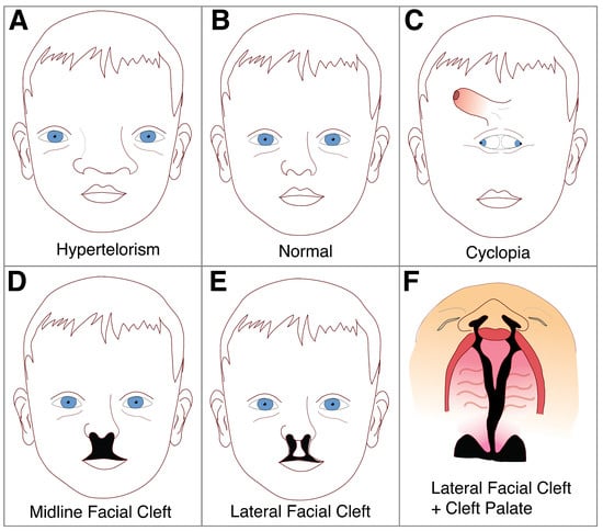 Facial appearances and associated conditions. (A) Hypertelorism—abnormally increased distance between eyes, often accompanied by general broadening of midline facial structures. (B) Normal, proportionate individual. (C) Cyclopia—characterized by undivided or partially divided eye fields, with displacement of the proboscis (putative nose) above the eyes. D. Midline Facial Cleft—facial cleft where the frontonasal mass is reduced and the maxillary prominences do not meet. (E) Lateral Facial Cleft—facial cleft where frontonasal mass growth is not reduced, however maxillary prominences failed to fuse. (F) Palatal view of a lateral facial cleft. Image adapted from Reference [117].