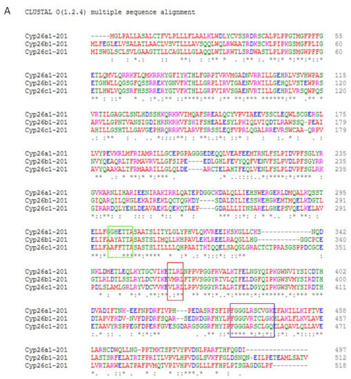 Despite similar biochemical functions, the individual three CYP26s proteins have only approximately 55% amino acid identity to each other, mostly based around the C’-haem domain (Figure 3A). However, each CYP26 protein is highly evolutionarily conserved between species (human, mouse and zebrafish) with the human to mouse amino acid identity being over 80% for each protein and CYP26B1 the most highly conserved and CYP26C1 the least conserved (Figure 3B). In amphioxus, three similar Cyp26 genes, Cyp261-3 have been identified which are clustered within the genome and possibly are the result of lineage specific duplication of an ancestral gene. Cyp261 and 3 are very responsive to RA levels and are induced to protect against teratogenic outcomes of inappropriate RA-mediated transcription. Cyp262 however, exhibits a complex developmental pattern, and is suggested to mediate developmental patterning in amphioxus [157,158]. An RA-inducible Cyp26 homologue has also been identified in ascidians expressed in the neural plate and tail-bud in a similar fashion to Cyp26a1 [141,146,159,160,161,162,163], reviewed [137,139,144,164].