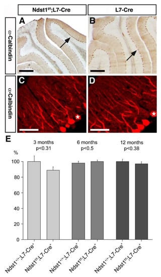 Therefore, we next employed immunohistochemistry using anti-calbindin antibodies to assess possible changes in the number and morphology of Purkinje cells. However, no differences in cerebellar folia development, laminar organization or cross-sectional areas of the molecular or granule cell layers were found between control and Ndst1f/f;L7-Cre+ mice, and no significant changes in the number, density or organization of Purkinje cells was observed. This suggested that survival of these projecting neurons in vivo does not require Ndst1 function (Figure 3A,B). Calbindin staining also showed that primary and secondary trees of Purkinje cells were present and similarly branched in Ndst1f/f;L7-Cre+ conditional mutant mice and Ndst1+/+;L7-Cre+ controls (Figure 3C,D). Lastly, the number of Purkinje cells was determined in 3 months, 6 months and 12 months old mice to assess possible neuronal cell death. Again, no significant differences were detected between Ndst1f/f;L7-Cre+ and Ndst1+/+;L7-Cre+ control mice (Figure 3E).