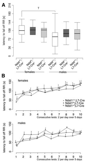 Dark–light test. (A) Latency to enter the light compartment. Exact Wilcoxon rank sum test, two tailed; * = p ≤ 0.05, T = 0.05 ≤ p ≤ 0.1; f Ndst1+/f;L7-Cre+ n = 11, f Ndst1f/f;L7-Cre+ n = 13, f Ndst1+/+;L7-Cre+ n = 9, m Ndst1+/f;L7-Cre+ n = 13, m Ndst1f/f;L7-Cre+ n = 9, m Ndst1+/+;L7-Cre+ n = 12; Ndst1f/f; f L7-Cre+ versus m Ndst1f/f;L7-Cre+: W = 25, p = 0.02338 (*); f Ndst1+/+;L7-Cre+ versus m Ndst1+/+;L7-Cre+: W = 26.5; p = 0.04883 (*). (B) Percentage of time spent in the light compartment. Exact Wilcoxon rank sum test, two tailed; ** = p ≤ 0.01, T = 0,05 ≤ p ≤ 0.1; f Ndst1+/f;L7-Cre+ n = 11, f Ndst1f/f;L7-Cre+ n = 13, f Ndst1+/+;L7-Cre+ n = 9, m Ndst1+/f;L7-Cre+ n = 13, m Ndst1f/f;L7-Cre+ n = 9, m Ndst1+/+;L7-Cre+ n = 12; f Ndst1+/+;L7-Cre+ versus m Ndst1+/+;L7-Cre+: W = 90.5, p = 0.007223 (**).