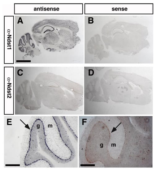 Widespread expression of Ndst1 in the adult brain, and partially overlapping Ndst2 expression in cerebellar Purkinje cells, cortex and hypothalamus. (A) Ndst1 mRNA is widely expressed in various brain areas, notably the hippocampus and the cerebellum. Scale bar: 2 mm. (B) sense control mRNA demonstrates specificity. (C) Ndst2 expression throughout the adult brain. (D) sense control mRNA. (E) In situ hybridization analysis demonstrates strong Ndst1 expression in cerebellar Purkinje cells, and weak but overlapping expression of the Ndst2 isoform (F). Scale bar: 200 μm. m: molecular layer, g: granule cell layer.