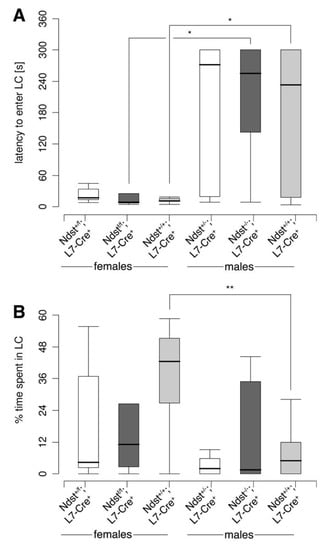 We first conducted the dark–light test as an unforced measure of anxiety (Figure 6). Mice were placed into a dark compartment with the opportunity to enter and explore an illuminated compartment. The latency to enter the light compartment and the percentage of entries into the light compartment were measured. As shown in Figure 6A, Ndst1f/f;L7-Cre+ mutant males showed enhanced latency to enter the light compartment if compared to Ndst1f/f;L7-Cre+ mutant females (Exact Wilcoxon rank sum test, W = 25, p = 0.02338 (*)). We also found a significant difference between Ndst1+/+;L7-Cre+ females and males, showing that females entered the light compartment significantly earlier than the male mice (Exact Wilcoxon rank sum test, W = 26.5, p = 0.04883 (*)). However, no genotype differences were determined, indicating normal anxiety in this experimental setting. Likewise, as shown in Figure 6B, Ndst1+/+;L7-Cre+ females and males differed significantly in time spent in the light compartment. Here, females spent significantly more time in the light compartment than male mice (Exact Wilcoxon rank sum test, W = 90.5, p = 0.007223 (**)). However, genotype differences were not detected.