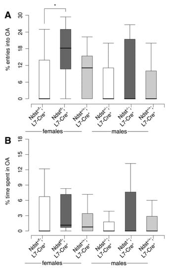 Mice were next confronted with a forced, potentially dangerous situation in the elevated plus maze (Figure 7). Mice were placed in the brightly illuminated, elevated maze with the choice to enter open or enclosed (protective) arms. Both the percentage of entries in the open arms (Figure 7A) and the percentage of time spent in the open arms (Figure 7B) were determined. We found that Ndst1f/f;L7-Cre+ females entered the open arms significantly more often than Ndst1+/f;L7-Cre+ heterozygous females (Exact Wilcoxon rank sum test, W = 38, p = 0.0442 (*)); however, no differences were found among male mice or female Ndst1f/f;L7-Cre+ and Ndst1+/+;L7-Cre+ mice. We also did not observe any significant differences in the time spent in the open arms between genotypes or between genders.