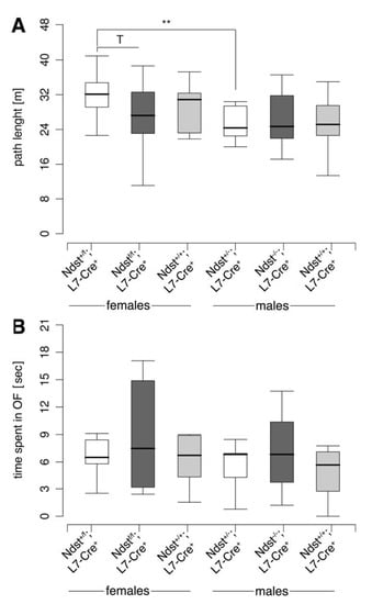 Open field test. (A) Path length in the open field. Exact Wilcoxon rank sum test, two tailed; ** = p ≤ 0.01, T = 0.05 ≤ p ≤ 0.1; f Ndst1+/f;L7-Cre+ n = 11, f Ndst1f/f;L7-Cre+ n = 13, f Ndst1+/+;L7-Cre+ n = 9, m Ndst1+/f;L7-Cre+ n = 13, m Ndst1f/f;L7-Cre+ n = 9, m Ndst1+/+;L7-Cre+ n = 12; f Ndst1+/f;L7-Cre+ versus m Ndst1+/f;L7-Cre+: W = 118, p = 0.005943 (**). f Ndst1+/f;L7-Cre+ versus f Ndst1f/f;L7-Cre+: W = 100.5, p = 0.096 (T). (B) Percentage of time spent in the center field. Exact Wilcoxon rank sum test, two tailed; f Ndst1+/f;L7-Cre+ n = 11, f Ndst1f/f;L7-Cre+ n = 13, f Ndst1+/+;L7-Cre+ n = 9, m Ndst1+/f;L7-Cre+ n = 13, m Ndst1f/f;L7-Cre+ n = 9, m Ndst1+/+;L7-Cre+ n = 12.