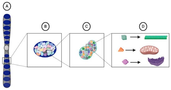 Illustration of Weismann’s vital units. Each chromosome, or idant (A), is composed of several ids (dark blue) (B) that are inherited intact from the parental germ cells within the germ plasm. Each id is composed of determinants (C) that are arranged in a particular architecture. Each determinant corresponds to a specific cell type in an organism and contains a particular assemblage of biophors (D), a group of molecules that, when released from the nucleus and into the cytoplasm, provide the starting material from which cellular components develop.