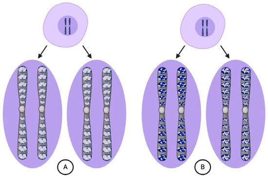 According to Weismann, cells can undergo either ordinary (A) or embryogenic divisions (B). (A) Ordinary divisions produce daughter cells with chromosomes bearing vital unit composition identical to the parental cell and maintain the germ plasm intact from the zygote through mature germ cells. (B) Embryogenic divisions produce daughter cells with chromosomes that bear different determinants in their ids depending upon their destined cell lineage.