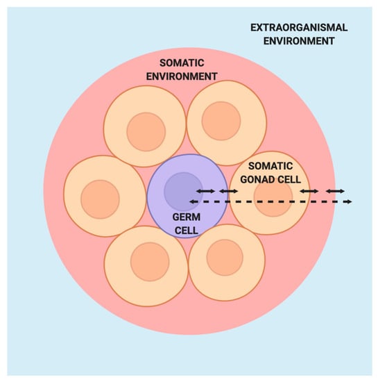 Model of germ cells in the absence of the Weismann barrier. Within the germ cell (purple), interactions between the nuclear and cytoplasmic components integrate signals from the surrounding somatic gonad cells, which themselves are responsive to signals from the germ cell. The germ cells and somatic gonad cells are situated within a larger somatic environment that is in turn influenced by the extraorganismal environment.