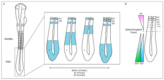The wavefront proposed in the Clock and Wavefront model [35] plays an important role in the correct positioning of each new somite boundary in the anterior-end of the PSM [38]. An anterior retinoic acid (RA) signaling gradient opposes posterior-derived Fgf and Wnt gradients, establishing the so-called determination front, where PSM cells become irreversibly committed to form a somite within the next 3–4 molecular clock oscillations [38,39,40]. Posterior-to-anterior gradients of Wnt and Fgf signaling activity maintain cells in an undifferentiated state in the posterior PSM. Overexpressing Fgf8 at the level of the determination front leads to the formation of smaller somites, while if Fgf signaling is inhibited, larger somites are formed [38]. Moreover, both Fgf and Wnt signaling are crucial for embryo elongation, thus coupling the process of somitogenesis with anterior-to-posterior elongation [41,42].