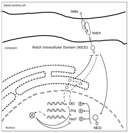 - Ferjentsik, Z.; Hayashi, S.; Dale, J.K.; Bessho, Y.; Herreman, A.; De Strooper, B.; del Monte, G.; de la Pompa, J.L.; Maroto, M. Notch Is a Critical Component of the Mouse Somitogenesis Oscillator and Is Essential for the Formation of the Somites. PLoS Genet. 2009, 5, e1000662. [Google Scholar] [CrossRef]