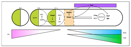 PSM cells located posteriorly to the determination front are under the influence of high levels of Wnt and Fgf signaling and express the paraxial mesoderm marker Tbx6 (Figure 4). As the embryo elongates and cells in the anterior PSM leave the Fgf8 domain, Tbx6 and Notch are able to activate Mesp2 expression, delimiting in the caudal boundary of the next somite to be formed. Mesp2 plays a central role in the formation of the somitic boundary (reviewed in [60]). Mesp2 activates Ripply2 expression, which then represses Tbx6 [60,61]. Mesp2 also activates EphA4 which in turn induces the expression of EphrinB2 rostrally, in the caudal region of the somite-to-be. Here, EphrinB2 initiates a molecular cascade leading to rearrangements in the extracellular matrix [62] and to a mesenchymal-to-epithelial (MET) transition, culminating in somite boundary formation. EphA and EphrinB2 are then restricted to the rostral and caudal portion of the somite, respectively, ensuring proper somite polarity [63] (Figure 4).