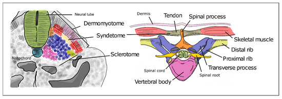 The sclerotome undergoes a re-segmentation process essential for the final configuration of the vertebrae and all the structures of the spine. After re-segmentation, the caudal segment of a sclerotome joins the rostral segment of the adjacent sclerotome to form a vertebra. Due to this process, each segment of the adult axial skeleton is derived from a caudal and rostral part of two consecutive somites instead of one somite. The dermomyotome maintains the initial segmented configuration of the somites, allowing the derived muscles to intercalate each skeletal segment. This is crucial for the mobility and stability of the axial skeleton in humans. The most ventral portion of the sclerotome then surrounds the notochord to give rise to the body of the vertebrae and the intervertebral discs. The notochord gives rise to the nucleus pulposus of the intervertebral discs. The vertebral arch originates from the sclerotome cells that surround the neural tube. The ribs originate from the sclerotome cells located in the ventro-lateral region (Figure 5) [65,66].