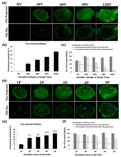 Photomicrograph depicts transfection efficiency of GFP through its fluorescence intensity in preantral follicles after electroporation. (a,b) Transfection of GFP increased gradually with increased voltage (30–120 V) within a single pulse. (c) However, this increased voltage caused deterioration in follicular morphology and reduced survival rate. (d,e) Consequently, multiple pulses of 30 volts at an interval of 10 s (1–5) were used; (f) where follicular morphology and survival was maintained until three consecutive pulses (i.e., 3 P of 30 V) were given with increased transfection efficiency. Beyond three pulses (4 and 5 P of 30 V), survival rate decreased (χ2 = 123.5, df = 8, p < 0.0001). Fluorescence intensity (arbitrary units) was quantified through ImageJ Software. ** p < 0.01 and *** p < 0.001 reflect a significant difference as compared to the single pulse of 30 V. Original magnification of photomicrographs was ×400.