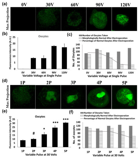 Pictorial representation showing optimization of GFP transfection through electroporation in mouse oocytes. (a–c) Increased voltage (60–120 V) at a single pulse reduced the survival rate of mice oocytes, (d–f) but lower voltage with multiple pulses showed improvement in the survival along with transfection efficiency up to three pulses (1–3 P of 30 V). After three pulses of 30 V (4–5 P), fluorescence intensity increased but with decreased survival (χ2 = 69.22, df = 8, p < 0.0001). The measurement of fluorescent intensity was done by ImageJ software. * p < 0.05 and *** p < 0.001 indicate significant differences compared to the single pulse of 30 V. # is non-significant. Original magnification of photomicrographs was ×400.