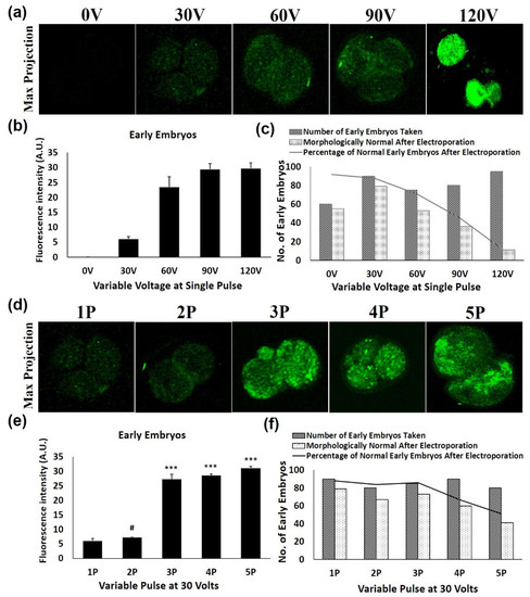 Similarly to follicles, in oocytes and early embryos, electroporation efficiency was increased with increasing voltage. Upon increasing the voltage from 30 V to 120 V, a slight increase in transfection was achieved but a drastic reduction in the survivability of oocytes (93.04% to 22.50%) and early embryos (87.77% to 11.57%) was witnessed along with impairment in the embryonic development. However, EGFP showed a significant expression by applying 30 V of 3 pulses at an interval of 10 s in both oocytes (p < 0.05) (Figure 2e) and early embryos (p < 0.001) (Figure 3e). Furthermore, the Pearson chi-square for oocytes (χ2 = 69.22; df = 8; p < 0.0001) and early embryos (χ2 = 55.29; df = 8; p < 0.0001) indicated a significant change in the survival of these cells when compared between all the conditions but no significant change was observed in survival until three multiple pulses in oocytes (χ2 = 0.09814; df = 3; p = 0.9921) as well as in early embryos (χ2 = 0.1411; df = 3; p = 0.9865). Moreover, survival dramatically decreased from 90.00% to 54.16% (Figure 2f) and 85.88% to 51.25% (Figure 3f) for 3 to 5 pulses in oocytes and early embryos, respectively.