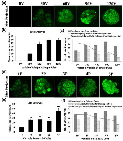 We then wanted to further understand whether these optimized conditions would show similar transfection efficacy in late stage embryos as well. Morulae stage embryos (late embryos) (Figure 4) were also transfected with the p-EGFP plasmid. Although the viability of the embryos declined (74.66% to 25.71%) with higher voltages (30 V to 120 V), fluorescence intensities followed the same trend as observed during electroporation of early embryonic stages with corresponding voltages. However, the highest survival rate was achieved with two pulses at 30 V (75.29%) and almost 70% of the survived embryos subsequently developed into blastocysts. There was no significant difference in the fluorescent intensity among two and three pulse groups at 30 V, but the three pulse group exhibited 15.29% more mortality than the two pulse group (Figure 4f). The reason behind the higher mortality rate in the three pulse group may be due to the slight zonal hatching process during late embryonic stages that generally reduces and thins the ZP membrane prior to implantation.