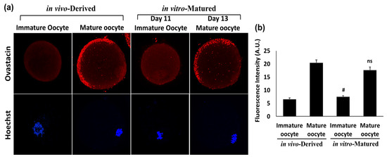 Authentication of an in vitro-matured oocyte obtained from a GFP electroporated preantral follicle through the immuno-localization of the oocyte maturation marker ovastacin. (a) Immature and mature oocytes derived in vivo were compared with in vitro-matured oocyte collected on day 11 and 13 from the preantral follicle after the electroporation with GFP, respectively. Ovastacin is known to localize throughout the cytoplasm of the immature mouse oocytes (germinal vesicle stage) and mostly concentrate at the cell periphery, whereas in MII mature oocytes, it localizes mainly in the microvillar domain of the oolemma. The expression pattern of ovastacin (red) was found to be similar for both the corresponding stages; in vivo-derived oocytes with in vitro-cultured oocytes from transfected preantral follicles. (b) Comparison of fluorescent intensities between in vivo derived vs. in vivo matured groups. # and ns indicate a non-significant difference in in vivo-derived vs. in vitro-matured groups, respectively. Original magnification of photomicrographs was ×400.