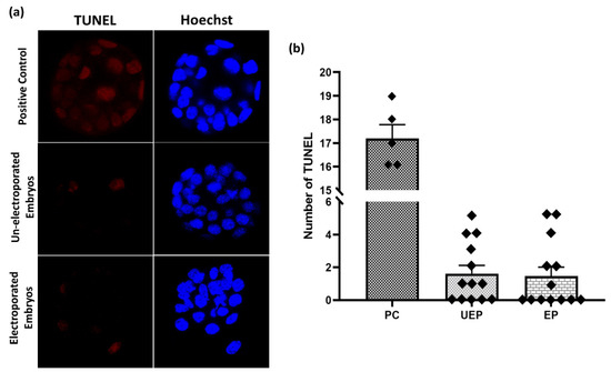 In the case of late embryos (morulae stage), a non-significant change in electroporation efficiency was observed by increasing the pulses from 2 to 3. Furthermore, two pulses of 30 V increased survival up to 75%, whereas beyond 2 pulses of 30 V decreased the percentage of embryo survival, as well as further development to the subsequent blastocyst stage. This might be due to the zona thinning and the blastocyst expansion process during late embryonic stages prior to implantation [28]. Moreover, the cell apoptosis assay was performed in order to validate the healthy embryonic development following electroporation. Apoptosis is a process by which defective cells are usually eliminated but it is not generally observed throughout normal embryonic development [29]. The initiation of apoptosis by chemical or physical injury during preimplantation embryonic development could lead to deletion or damage of important cell lineages and hence affect the normal embryonic development that may lead to embryonic malformation or abortion [17,30]. The results of the TUNEL apoptosis assay showed no significant difference in the apoptotic nuclei number of blastocysts developed in vitro from electroporated embryos in contrast with normal un-electroporated blastocysts grown in vitro. To authenticate the TUNEL apoptosis assay, a positive control experiment was also designed simultaneously, which showed ample TUNEL-positive nuclei. Thus, suggesting that these parameters are safe for intact embryo electroporation and do not induce any embryo impairment after electroporation.