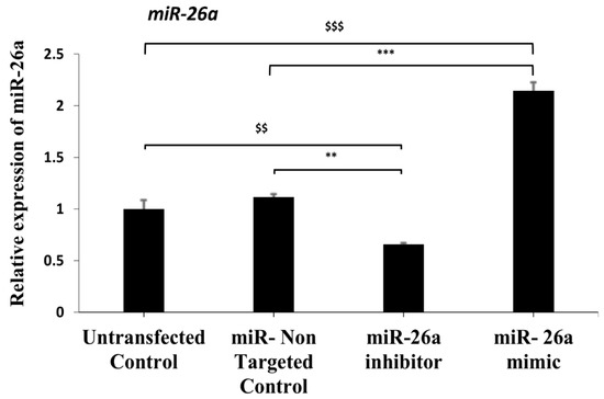 To evaluate the efficiency of electroporation for the transfection of a miRNA inhibitor and mimic, a mmu-miR-26a inhibitor and mimic and a miR control were transfected in preantral follicles. As per real time PCR analysis, the miR-26a inhibitor-transfected follicles showed significant down regulation of mmu-mir-26a expression as compared to the miR- non-targeted control group (p < 0.01). Furthermore, the miR-26a mimic-transfected follicles showed highly significant upregulation of the expression of mmu-mir-26a as compared to the miR- non-targeted control group (p < 0.001). In addition, both the mmu-miR-26a inhibitor (p < 0.01) and mimic (p < 0.001) groups manifested efficient transfection through electroporation, when compared with the untransfected control group in which follicles were only subjected to electroporation conditions. Collectively, these results authenticated the effectiveness of the electroporation process in transfecting miR- inhibitors and mimics in the follicles (Figure 7).