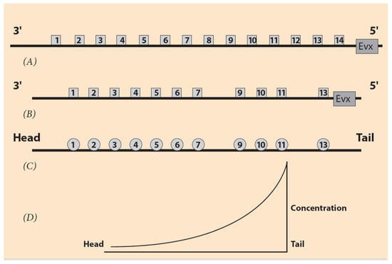 Ordering of Hox genes and the sequence of the ontogenetic units. (A) Hox gene ordering of a (theoretical) common ancestor. Gene Evx is located next to the 5′ end of the Hox cluster. (B) Ordering of the mouse HoxA cluster. Hox8 and Hox12 are missing. (C) The corresponding ontogenetic units of the mouse along the A/P axis. (D) The steady state monotonic concentration gradient of a morphogen. The peak is at the tail region.