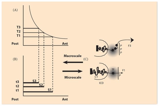 The macroscale morphogen gradient and the microscale Hox gene clustering in space and time (adapted from Papageorgiou S. (Biology 2017: 6, 32)). (A) Concentration thresholds (T1,T2,T3) divide the A/P axis in partially overlapping expression domains. (B) The time sequence (t1, t2, t3) combined with the thresholds sequence (T1, T2, T3) determines the Hox1, Hox2, Hox3 activation in space and time. S1, S2, S3 are the partially overlapping and nested expression domains of Hox1, Hox2, Hox3. (C) (bottom) In an anterior cell of S1, a small forceF1, pulls Hox1 (black spot) out of the chromatin territory (CT) toward the Interchromosome Domain (ICD) in the regime of the Transcription Factory (TF) (grey domain). Allocation of polar molecule P opposite the telomeric end of the Hox cluster (bottom). At a later stage (top), in a more posterior location of S3, a stronger force F3, pulls Hox1, Hox2, Hox3 out of CT in the TF (Allocation of 3P molecules).