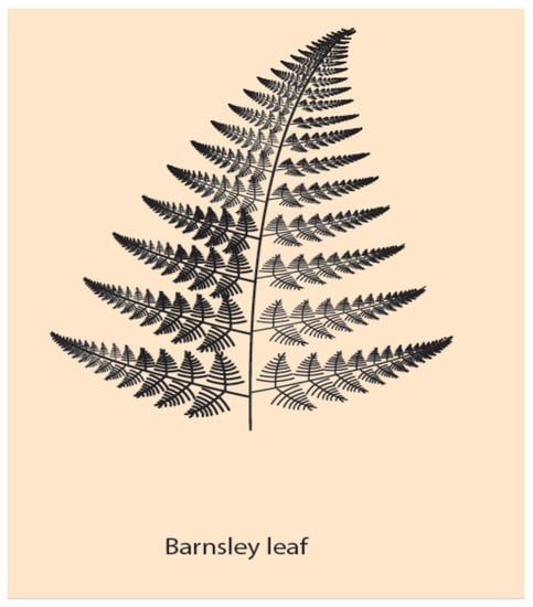 A self-similar design of a Barnsley leaf: Each branch of the leaf is similar to all other branches, differing only in their scale (bigger or smaller).