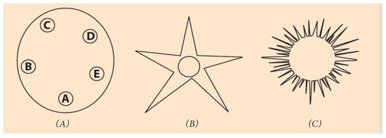 The Symmetries of Section 4 underlie the description of organisms whose embryos grow along the A/P axis, retaining the same pattern in their adult life, e.g., arthropods or vertebrates. The embryos of these ‘directly’ developing animals look like miniatures of the adult organisms. Besides these animals, there is a large variety of invertebrates which, at the very early stages of embryogenesis, are ‘indirectly’ developing a larva next to the body of the embryo where the pattern of the adult animal is formed. This body pattern differs substantially from the initial embryo organization along the linear A/P axis [38,39,40,41]. Strongylocentrotus purpuratus is a typical indirectly developing sea urchin whose larva organization is circular (Figure 5).