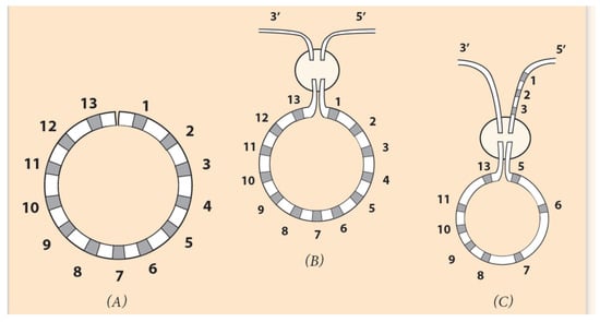 In what follows, another ordering mechanism is proposed based on the symmetries of the preceding Section. According to this hypothesis, the initial linear Hox gene organization is transformed into a circular Hox gene reorganization at the larva stage [42]. (Figure 5). (This organization change has been observed in some vertebrates). Double strand break (DSB) is a mechanism used in experiments of DNA rearrangements to cure serious illnesses like cancer, but it is also a tool in spontaneous DNA reshufflings, leading to evolutionary novelties. In a recent review, both experimental and spontaneous DSB were extensively treated [43]. In hundreds of millions of years of evolutionary history, DSB has played a critical role in the pathway from simple ontological structures to more complex entities [35].