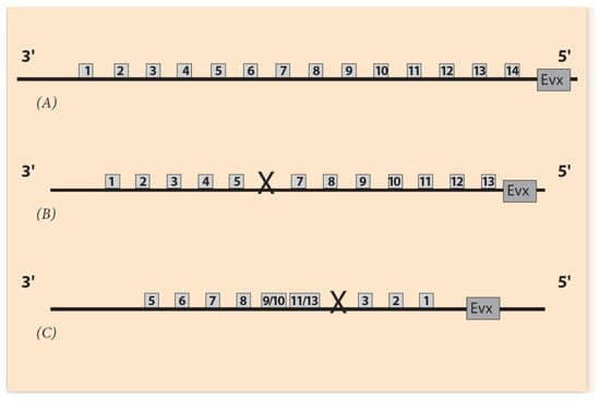 - Izpisua-Belmonte, J.C.; Duboule, D. Murine genes related to the Drosophila AbdB homeotic genes are sequentially expressed. EMBO J. 1991, 10, 2279–2289. [Google Scholar] [CrossRef]