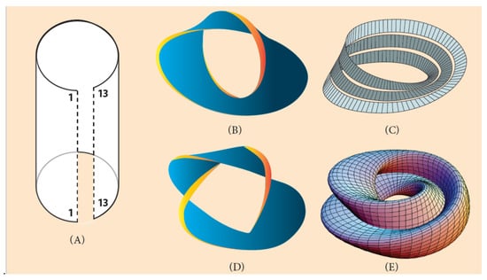 This procedure (of bending and twisting) may be extended to three-dimensional surfaces. A multiple turning around 360° with one twisting creates a multiple Moebius strip in the shape of a ring, the so-called ‘Moebius torus’ (Figure 8C). If additional twists are performed, more complex structures are created, suitable to host several invertebrate genomes with variable symmetries (Figure 6) [45]. As an example, a Moebius torus can accommodate a sequence of Hox clusters in the chromosome or the genome of a starfish with five podia and five twisting (Figure 5B).
