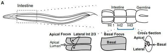 - Achilleos, A.; Wehman, A.M.; Nance, J. PAR-3 mediates the initial clustering and apical localization of junction and polarity proteins during C. elegans intestinal epithelial cell polarization. Development 2010, 137, 1833–1842. [Google Scholar] [CrossRef] [PubMed]