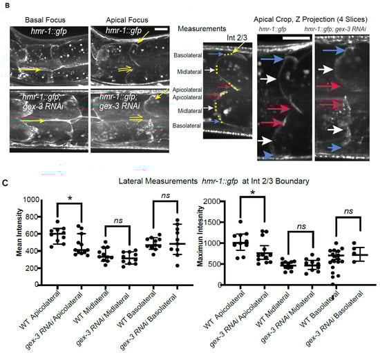 We further examined animals carrying both hmr-1::mKate2, in magenta, and Pvha-6::PH::gfp, in green, to ask if changes at lateral regions correspond to changes in Cadherin enrichment (Figure 3C). In control animals the lateral membranes marked with hmr-1::mKate2 appear as uniform, thin regions. When gex-3 was reduced, some lateral regions became more diffuse and wider (Figure 1 and Figure 3). Measuring the width of the membrane showed an average of 0.41 microns for controls and 0.55 microns for gex-3 RNAi animals (Figure 3D). While apicolateral and basolateral regions remain attached, and co-express HMR-1::mKate2 and PH::GFP, changes are visible at midlateral regions, including reduced accumulation of both HMR-1::mKate2 and PH::GFP (Figure 3C), and some hmr-1 RNAi animals appeared to have lateral membrane separations Figure 3C).