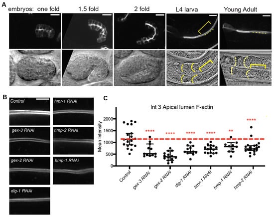 Since loss of WAVE had the largest effects on apicolateral populations of Cadherin, we wanted to next test if WAVE and Cadherin were contributing to apical lumen F-actin accumulation in vivo, as we saw with fixed adults and phalloidin staining. We therefore developed a new reagent to detect F-actin in adult intestines using the glo-1 promoter [26], driving Lifeact fused to TAG-RFP (gift of Daniel Shaye), marked with the rol-6 dominant Roller mutation [27]. We made integrated lines of this new strain that allowed us to monitor F-actin accumulation in the developing embryonic intestine and all through larval and adult stages (Figure 2A,B). As we have seen with other markers for endogenous F-actin, Pglo-1::Lifeact::TAG-RFP becomes enriched apically as the embryonic intestine becomes polarized. As the embryos develop, the signal becomes more enriched apically. In L4 larvae and adults, most of the expression is found at apical regions surrounding the lumen, while lower enrichment is seen at lateral regions (Figure 2B).