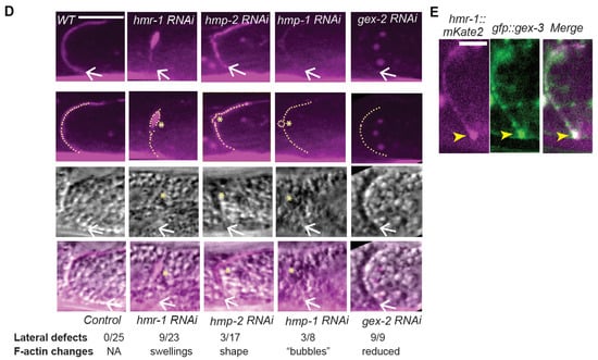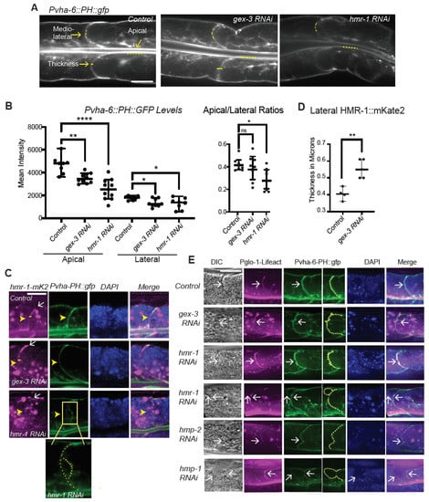 To examine how changes in lateral F-actin corresponded to changes at the lateral membrane, we next crossed the new Pglo-1::Liifact::TAG-RFP strain into Pvha-6::PH::gfp (Figure 3E). While lateral F-actin enrichment illustrated by Pglo-1::Lifeact::RFP is thin and uniform in controls, loss of gex-3 by RNAi resulted in altered F-actin that corresponded to membrane expansions and deformations. Loss of Cadherin/hmr-1 via RNAi also resulted in membrane expansions and deformation, and shifts in F-actin enrichment at subsets of the lateral membranes. In some animals depleted of hmr-1 or hmp-1, there were areas of reduced F-actin that corresponded with large lateral membrane extensions surrounded by PH::GFP, and devoid of F-actin (Figure 3E, panels with two white arrows). This raised the possibility that these F-actin and Cadherin changes were affecting the lateral membrane directly.