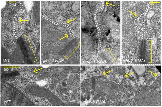 In summary, either by live imaging, or by examining fixed animals viewed by EM, we documented changes in lateral membrane of the intestine when Cadherin/HMR-1 or WAVE components including gex-2 and gex-3 were depleted via RNAi feeding. We did not see complete loss of adhesion, and instead noted small gaps appearing, visible by EM (Figure 4) and sometimes by DIC (Figure 2 and Figure 3).