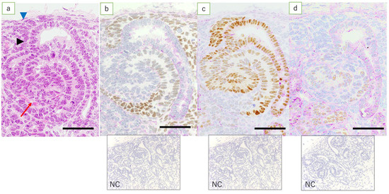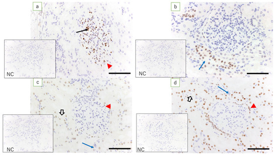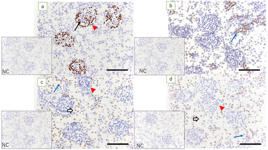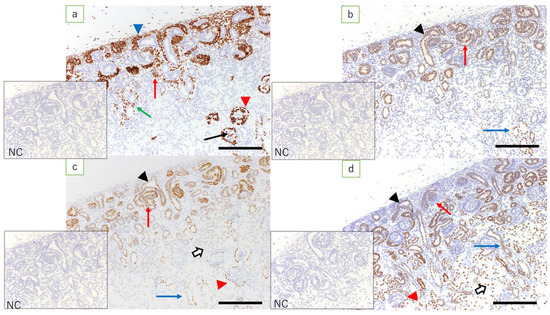 Ewe’s kidney (immunostaining, scale bar: 100 μm). (a) Expression of WT1 is found in glomerular epithelial cells (arrow) and epithelial cells of Bowman’s capsule (red arrowhead); (b) low expression of Pax2 is found only in the collecting duct epithelial cells (blue arrow); (c) expression of Pax8 is found in epithelial cells of Bowman’s capsule (red arrowhead), tubular epithelial cells (white arrow), and epithelial cells in the collecting duct (blue arrow); and (d) expression of HNF1β, which is equivalent to that in the kidney in term lambs, is found in epithelial cells of Bowman’s capsule (red arrowhead), tubular epithelial cells (white arrow), and epithelial cells in the collecting duct (blue arrow); NC: negative control.