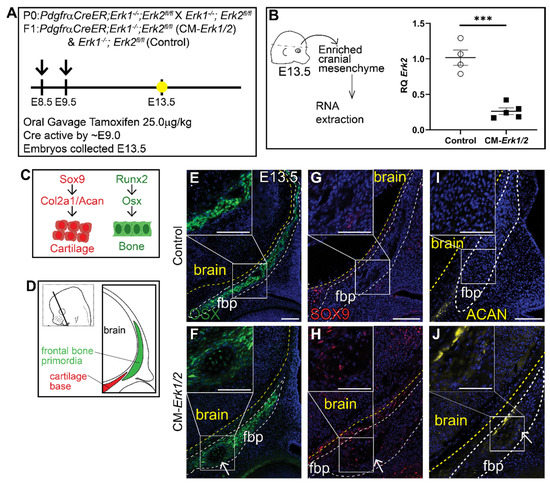 Loss of ERK1/2 results in diminished expression of OSX, and ectopic expression of chondrocyte fate markers at E13.5. Schematic depicting the gavage regimen and timing of deletion of Erk2 (A). (B) Schematic depicting the work flow and tissue source for the RNA analysis, RT-qPCR analysis depicting the relative quantity of mRNA transcripts for Erk2 demonstrating deletion efficiency of gavage regimen. p(***) = 0.0002. Bone and cartilage cell fate and marker schematic (C) and orientation and plane of specimens (D). Immunofluorescence for calvarial progenitor marker, OSX (E,F), and chondrocyte markers, SOX9 (G,H) and Aggrecan (ACAN) (I,J) at E13.5. Arrows indicate ectopic cartilage formation. fbp, frontal bone primordia; n = 3–5.