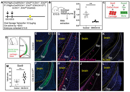 Knockdown of Erk1/2 results in ectopic expression of SOX9 and Col2a1 but not OSX or Aggrecan. (A) Schematic depicting the gavage regimen and timing of deletion of Erk2. (B) Schematic depicting the work flow and tissue source for the RNA analysis, RT-qPCR analysis depicting the relative quantity of mRNA transcripts for Erk2 demonstrating deletion efficiency of gavage regimen. 70% knockdown of Erk2 is achieved with a minimal gavage dosage (1.25 mg/kg Tamoxifen). p(**) = 0.0036 (C) Bone and cartilage cell fate and marker schematic. (D) Schematic indicating the orientation and plane of specimens. (E,F) Immunofluorescence of OSX at E13.5. (G,H) There is increased SOX9 expression in the frontal bone primordia of Erk1/2 mutants relative to controls. (I,J) HCR-Col2a1 in situ stain in CM-Erk1/2 mutants and controls. (K,L) Aggrecan (ACAN) immunofluorescence shows no change in the downstream marker of SOX9 at E13.5. (M) Percent SOX9+ cells is increased in the mutant relative to the control. White arrows indicate presence of ectopic SOX9 within the fbp. Pink arrowheads and arrows point to edge of Col2a1 expression boundary in the control and mutant, respectively. fbp, frontal bone primordia; n = 3–10.