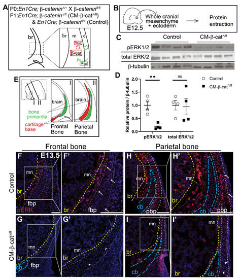 ERK signaling is diminished in CM-β-catΔ/flmutants. (A) Schematic depicting the status of Wnt signaling in the cranial mesenchyme and overlying ectoderm in this mouse model of Wnt signaling deletion. br, brain; m, mesenchyme; e, ectoderm. β-catenin is deleted in the cranial mesenchyme preventing mesenchyme Wnt signaling. The ectoderm is able to secrete Wnt ligands and undergo Wnt signaling. (B) Schematic depicting the work flow and tissue source for the protein analysis in panels C and D. (C,D) Expression of activated ERK1/2 (pERK1/2) and total ERK1/2 relative to β-tubulin expression in En1Cre;β-cateninfl/+ (control) and En1Cre;β-cateninΔ/fl (CM-β-catΔ/fl) normalized to control. p(**) = 0.0026 (E) Schematic indicating the plane and orientation of specimens. (F–I’) Immunofluorescence staining of pERK1/2 in control and CM-β-catΔ/fl coronal sections at E13.5 in the frontal (F–G’) and parietal bone regions (H–I’). Yellow lines demarcate the br, brain; blue lines demarcate the cb, cartilage base; mn, meninges. Arrows denote pERK1/2 signal in the bone primordia of the controls and arrowheads denote lack of signal in the CM-β-catΔ/fl. fpb, frontal bone primordia; pbp, parietal bone primordia; n = 4.