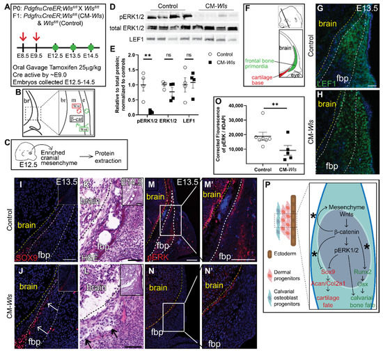 The relative expression of mRNA was analyzed using RT-qPCR as previously described [40]. Embryos at E12.5 or E13.5 were microdissected to isolate the cranial mesenchyme. The resulting tissue population is enriched cranial mesenchyme, following manual removal of the ectoderm and brain tissues. RNA was isolated as previously described [40,44]. Relative mRNA expression was quantified using 4 ng of cDNA on a StepOne Plus Real-Time PCR System (Life Technologies, Carlsbad, CA, USA) and the ΔΔCT method [45]. Commercially available TaqMan probes (Life Technologies, Carlsbad, CA, USA) specific to each gene were used: Erk1 (Mm01278702_gH), Erk2 (Mm01171077_m1), Lef1 (Mm00550265_m1), Tcf1 (mm00493445_m1), Axin2 (Mm00443610_m1), Sox9 (Mm00448840_m1), OSX/Sp7 (Mm04209856_m1), Runx2 (Mm00501584_m1), Col2a1, Aggrecan (Mm00545794_m1), β-actin (ActB, 4352933E), Pdgfrα (Mm00440701_m1), and Wls (Mm00509695_m1).