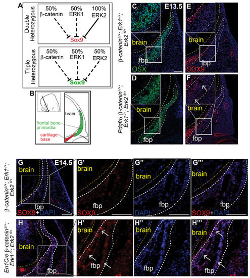 Triple heterozygous β-catenin;Erk1/2 mutants demonstrate genetic interaction between the Wnt and ERK signaling pathways in SOX9 transcription. (A) Schematic describing genetic interaction hypothesis between Wnt and ERK signaling pathways to repress SOX9. (B) Schematic illustrating coronal sections. Immunofluorescence of OSX (C,D) and SOX9 (E,F) at E13.5 in β-cateninΔ/+; Erk1−/+; Erk2 fl/+ and Pdgfrα β-cateninΔ/+; Erk1−/+; Erk2 fl/+ heterozygous embryos. Immunofluorescence of SOX9 at E14.5 in β-cateninΔ/+; Erk1−/+; Erk2 fl/+ and En1Cre β-cateninΔ/+; Erk1−/+; Erk2 fl/+ embryos (G–H’’’). Yellow line demarcates brain, white dashed lines demarcate fbp and region of interest. Arrows identify ectopic SOX9 expression within the fbp. fbp, frontal bone primordia; n = 3.