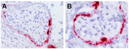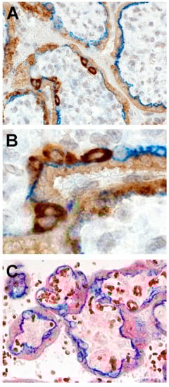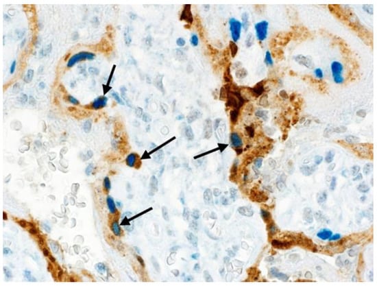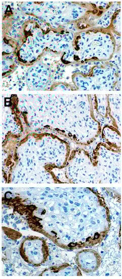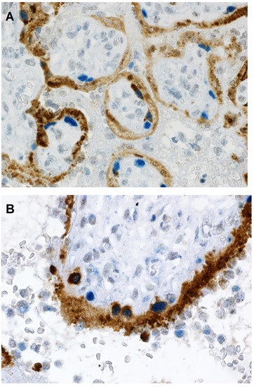 - Schwartz, D.A.; Baldewijns, M.; Benachi, A.; Bugatti, M.; Bulfamante, G.; Cheng, K.; Collins, R.R.J.; Debelenko, L.; De Luca, D.; Facchetti, F.; et al. Hofbauer cells and coronavirus disease 2019 (COVID-19) in pregnancy: Molecular pathology analysis of villous macrophages, endothelial cells, and placental findings from 22 placentas infected by severe acute respiratory syndrome coronavirus-2 (SARS-CoV-2) with and without fetal transmission. Arch. Pathol. Lab. Med. 2021. [Google Scholar] [CrossRef]