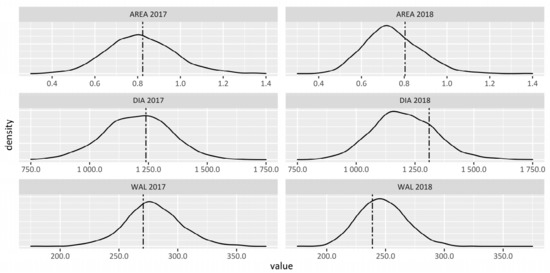 The population showed a broad variation for all traits between genotypes (Figure 1), representing a promising resource for GWAS. The coefficient of variation across all genotypes of the population (CV, Table 1) was approximately in the dimension of other traits successfully investigated in HEB-25 [14]. Whereas DIA had a stable mean of approximately 1.2 mm across years (t-test, p = 0.788), the values for WAL were significantly (t-test, p < 0.001) higher in 2017 (279 µm) than in 2018 (247 µm, Table 1). The impact of the factor year on the trait WAL is also reflected in the high estimate of the environmental variance component, while it had no impact on DIA (Table 2). The difference in WAL between years might be explained by changed environmental conditions under naturally occurring drought stress in 2018 (Figure S1). Drought might have directly affected WAL, while DIA, as the more heritable trait, remained unaffected (Table 2). The analysis of broad-sense heritability resulted in H2 = 73.3% for DIA, H2 = 52.6% for WAL and H2 = 67.0% for AREA. Furthermore, it was striking that Barke, the reference elite parent of the population, had an increased DIA and AREA, while it had a thinner WAL compared to the population mean.
