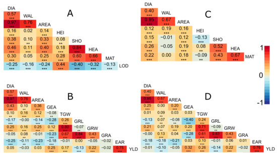 Correlation chart (Pearson correlation coefficients) of peduncle traits with developmental traits 2017 (A) and 2018 (C) and yield traits 2017 (B) and 2018 (D). The heatmap coloring indicates the correlation strength. Asterisks indicate the significance level (* p < 0.05, ** p < 0.01, *** p < 0.001). Autocorrelations of traits between years were 0.57 (p < 0.001) for DIA, 0.37 (p < 0.001) for WAL and 0.51 (p < 0.001) for AREA. Abbreviations: HEI: Plant height, SHO: Time to shooting, HEA: Time to heading (flowering time), MAT: Time to maturity, LOD: Lodging, YLD: Grain yield, TGW: Thousand grain weight, GRW: Grain width, GRL: Grain length, GRA: Grain area, GNE: Grain number per ear, EAR: Ears m−2.