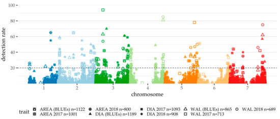 Generally, the traits showed different prediction abilities (Table 3). Whereas the GWAS calculated with the BLUEs of DIA resulted in an average of 36.81 significant SNPs at a prediction ability of 47%, the GWAS with the WAL data did not exceed 20% prediction ability, with 27.15 significant SNPs on average. AREA, as a derived trait of DIA and WAL, performed with 40% prediction ability and 32.70 SNPs per cross-validation run on average. It is striking that the GWAS performed with a higher prediction ability for DIA and AREA in 2017, while in 2018, the prediction ability for WAL exceeded the result of the trial year 2017. For WAL, differences in GWAS prediction ability between years were not surprising due to the high impact of the environmental variance component (Table 2). Presumably, drought and the lack of heavy rainfall events and lower humidity in general led to no lodging and fewer pathogens in 2018. This lack of external influence on the culm seemed to result in a better prediction ability for WAL 2018. The difference between DIA in the single-year GWAS outcomes was not expected to be that pronounced because of its better heritability. Taking into account the differences between the outcome of the GWAS for each single year and the results of BLUEs, 2017 and 2018 need to be considered comparatively to evaluate QTL.